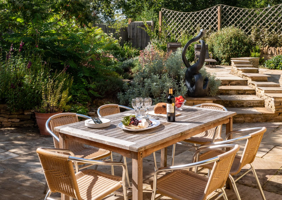 Double doors lead to a south-facing terrace and enclosed garden with wide countryside views. The garden is wheelchair accessible, furnished for outdoor dining and surrounded by peaceful Cotswold scenery.